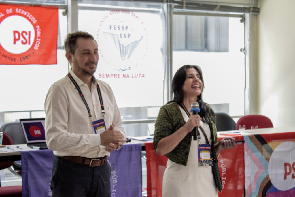 No contexto da programação formativa, uma das atividades contou com a participação de Eduardo Becker, presidente em exercício da Federação dos Sindicatos dos Servidores Públicos do Estado de São Paulo (FESSP-ESP), e Karla Campos, diretora de Relações Intersindicais e Formação Sindical da FESSP-ESP, que conduziram uma apresentação abordando temas centrais para o movimento sindical contemporâneo.